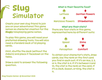 Create your own slug friend to join you on your adventures! This game serves as character creation for the Slugly roleplaying game series.