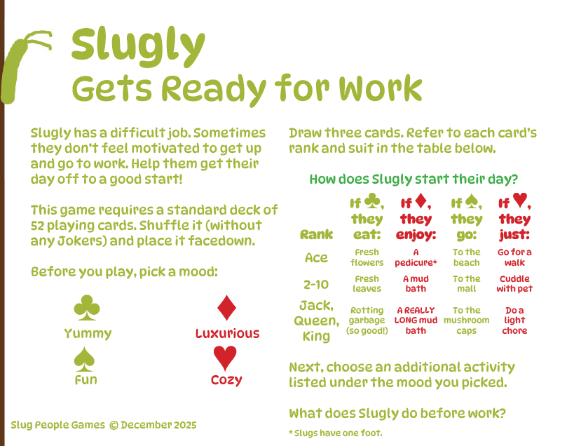 Slugly has a difficult job. Sometimes they don’t feel motivated to get up and go to work. Help them get their day off to a good start!