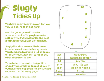 Note: If you have played Slugly and Friends Dig for Treasure, you may carry over your items from that game, instead of drawing 10 new items.