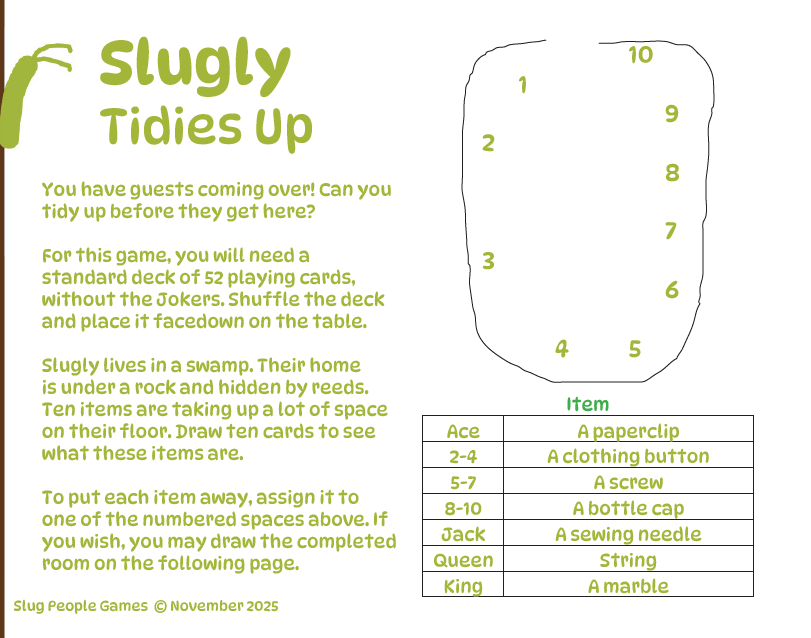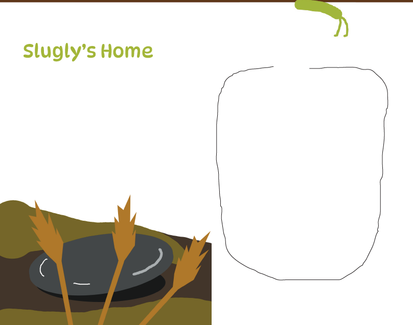 You may either play as Slugly, or create your own character using the Slug Simulator. If you create your own character, feel free to draw their home on the second page, based on the place where they live. (Slugly lives in the reeds of a swamp.)